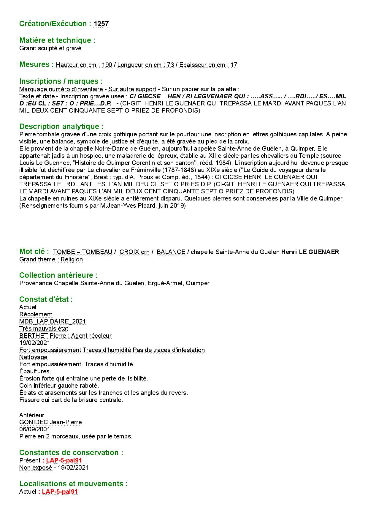 Une pierre tombale isssue de l'ancienne Chapelle Sainte Anne du Guelen portant l'inscription : "CI-GIT HENRI LE GUENAER QUI TREPASSA LE MARDI AVANT PAQUES L'AN MIL DEUX CENT CINQUANTE SEPT O PRIEZ DE PROFONDIS" est stockée dans les réserves du musée breton. Comme elle est cassée en 2, il n'est pas possible de la montrer au public.